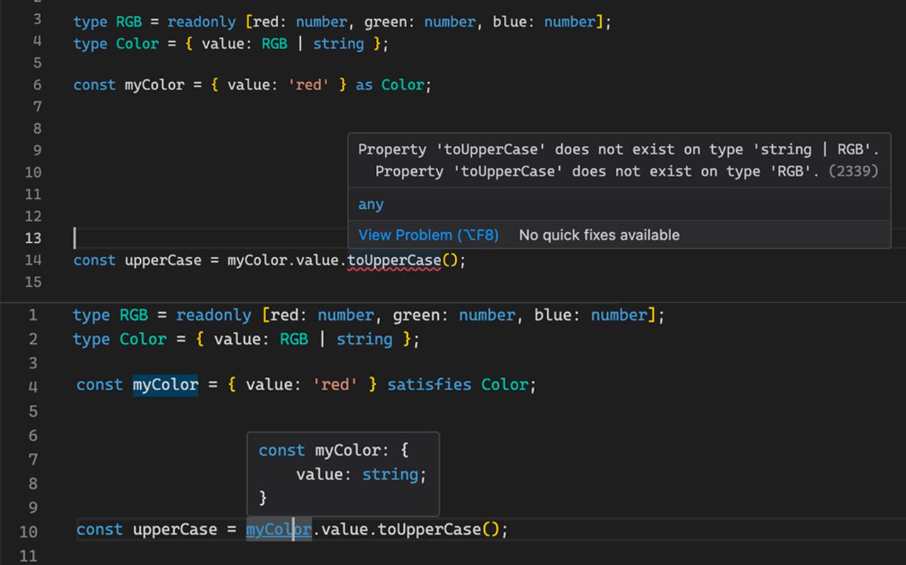 В TypeScript 4.9 появился оператор satisfies, который похож на оператор as, но работает немного иначе.