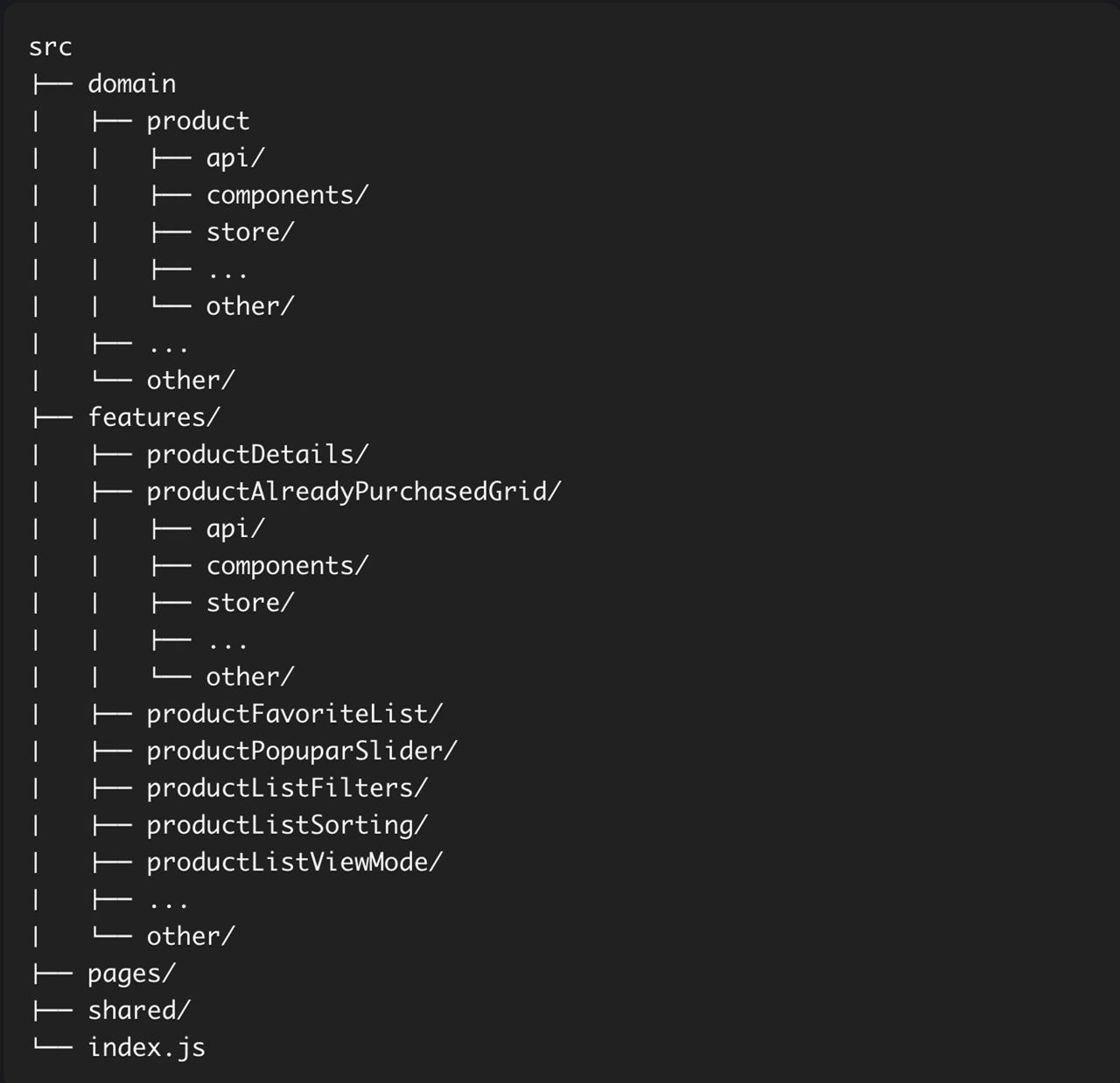 shared/componentsбудут лежать, обычные кнопки, радио кнопки и прочее - domain - базовый UI для бизнес-сущностей (домена) проекта, например карточка товара. Простая аналогия (но не совсем правильная) - в домене можно хранить все то, что хранится в базе данных на бекенде.