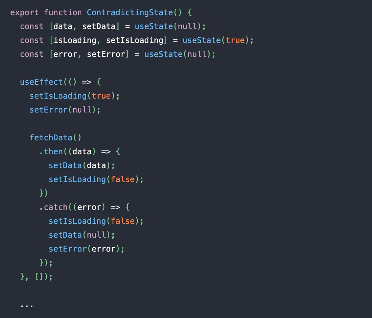 Среди описанные проблем нашёл практически кусок своего кода, связанный с асинхронными запросами — пример как не надо делать прикреплён. Чтобы не совершать таких ошибок, нужно вспомнить о некоторых рекомендациях, когда лучше использовать useReducer: